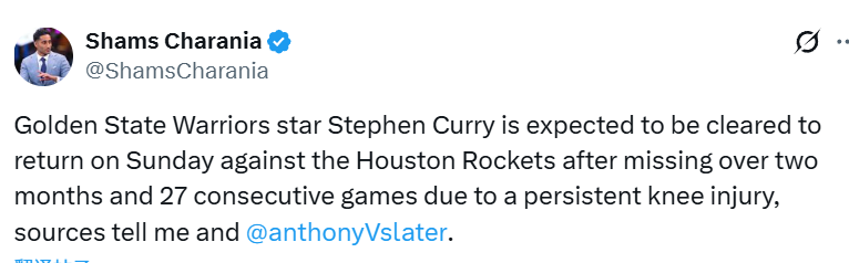 2026-04-04 05:00北京时间4月4日,据名记Shams报道,联盟消息人士透露,在顺利完成两场队内对抗赛后,勇士球星斯蒂芬-库里预计将于下周一对火箭的比赛正式获准复出。此前他因右膝持续性伤势,已连续缺阵27场比赛。