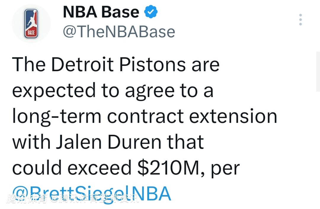 2026-04-04 06:40北京时间4月4日,据记者Brett Siegel报道,活塞预计将与首次入选全明星的杰伦-杜伦签下长约,合同金额大概率超2.1亿美元,尤其若杜伦入选最佳阵容,薪资还会更高。