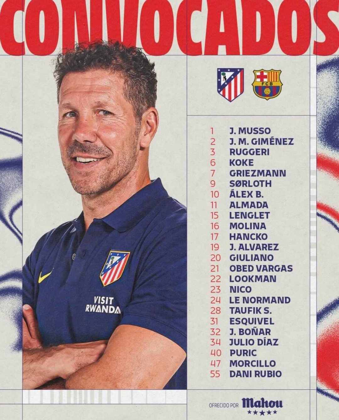 2026-04-04 20:10马德里竞技官方公布了本轮西甲主场对阵巴塞罗那的阵容名单,马科斯·略伦特因停赛缺席,奥布拉克、卡多索因伤无缘,此前同样传出有伤的瑟洛特依然在列。