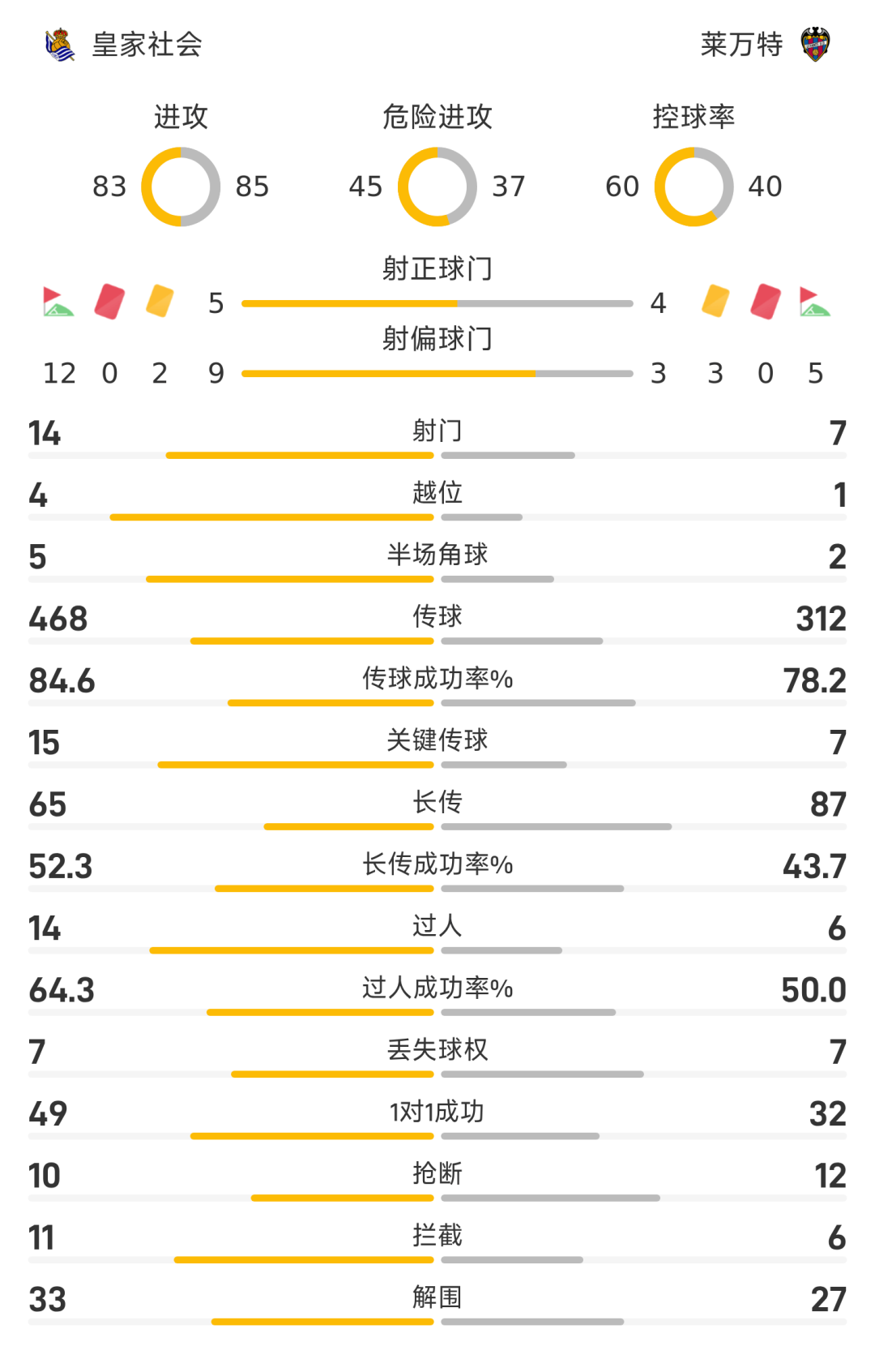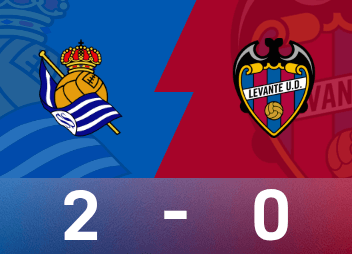 2026-04-04 22:1025/26赛季西甲联赛第30轮,皇家社会2-0战胜莱万特。上半场比赛,马丁角球进攻中头球破门,随后格德斯多次射门击中门框,替补登场的门德斯在第83分钟接马林的传中推射破门扩大领先优势。最后时刻,奥斯卡松单刀不进又单刀破门被吹,最终皇家社会顺利重回胜轨。