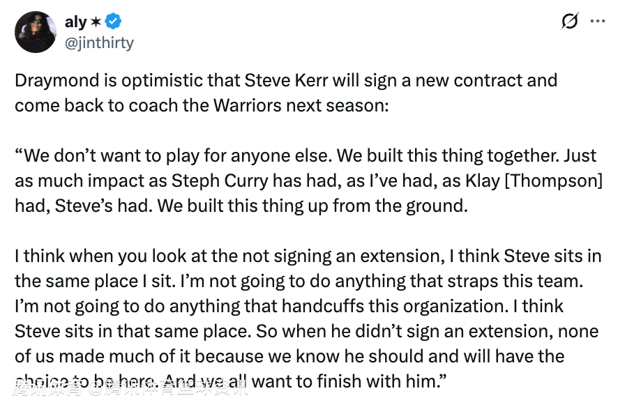 “我觉得,关于他没提前续约这件事,科尔和我想法是一样的。我不会做任何会拖累球队的事,也不会做任何束缚这支球队未来的决定。我觉得科尔也是这么想的。所以他没续约的时候,我们谁都没太当回事,因为我们知道,他完全可以、也一定会选择留在这里。我们所有人都想和他一起,走完这段路。”