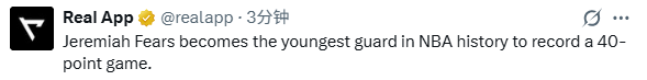 除此之外,根据数据统计显示,费尔斯是本届第二位单场得分40+的新秀球员(第一位是弗拉格),也是NBA历史上能单场得到40+的最年轻后卫(超越爱德华兹)。而如果按照所有位置计算,费尔斯能排名历史第4年轻,仅次于弗拉格、詹姆斯和GG-杰克逊(超越了杜兰特)。