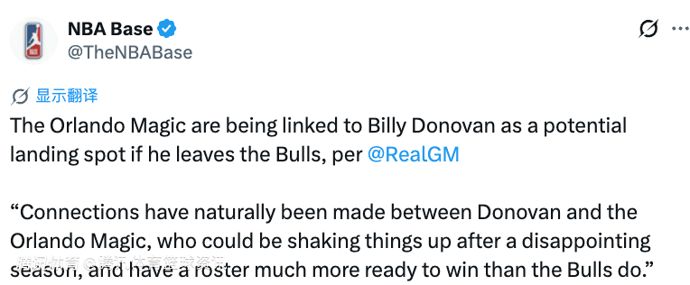 该媒体表示,多诺万与奥兰多魔术之间的关联是自然而然的——魔术在经历了一个令人失望的赛季后,很可能会对教练组进行调整,而且他们的阵容相比公牛,具备更强的即战力和冲冠潜力。