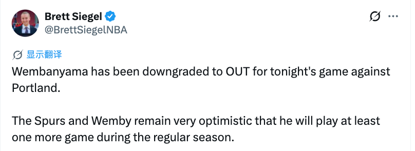 2026-04-09 01:30北京时间4月9日,据美记Brett Siegel报道,文班亚马将缺席今天对阵开拓者的比赛,不过马刺和文班亚马本人都非常乐观,他会在常规赛剩余阶段至少出战一场。