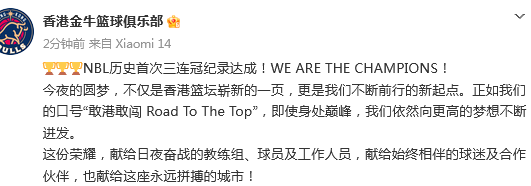 赛后,香港金牛发文:NBL历史首次三连冠纪录达成!WE ARE THE CHAMPIONS!